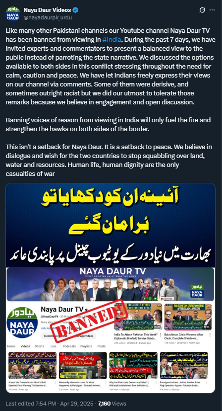 The next wave of bans and blocks hit Pakistani entertainment channels and artists. Beginning April 30, Pakistani entertainment YouTube channels and the social media accounts of artists, especially Instagram accounts, started to be banned in India. Indian users who attempted to access the censored content were met with messages such as the one below: