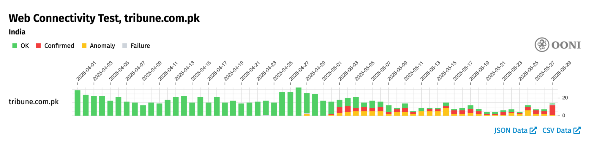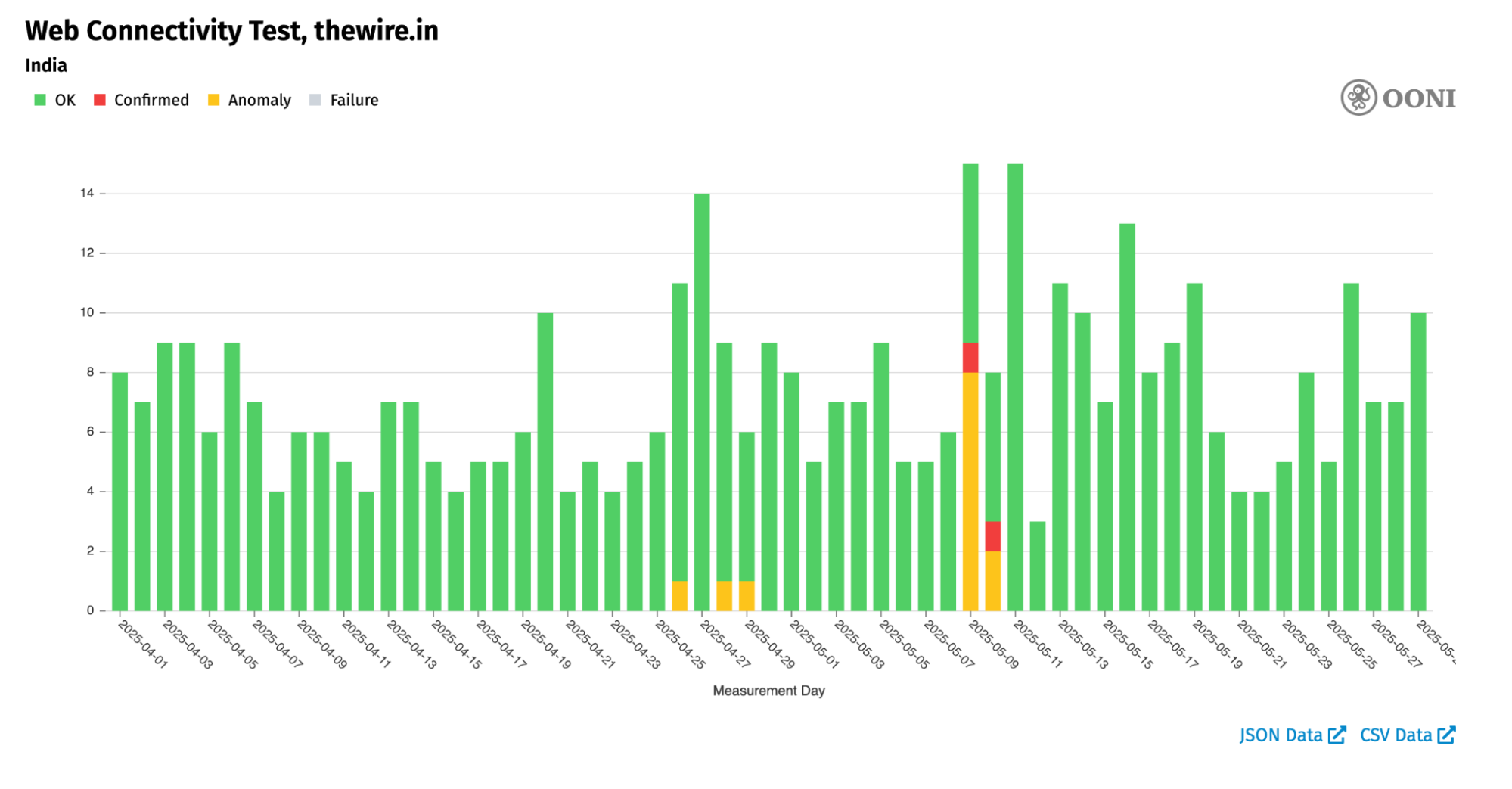 Chart: OONI Probe testing of thewire.in in India between 1st April 2025 to 29th May 2025 (source: OONI data).